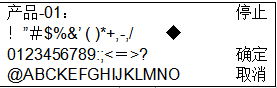[箭頭]鍵,將光標(biāo)對(duì)準(zhǔn)輸入文字的位置(英文數(shù)字,假名,記號(hào)),按[確認(rèn)] 鍵,則可以在[品名區(qū)域]中輸入。向左移動(dòng),向右移動(dòng)按[箭頭]鍵,將對(duì)準(zhǔn)[向左移動(dòng)][向右移動(dòng)]的位置,按[確認(rèn)]鍵,則[品名區(qū)域]的文字選擇位置向左或向右移動(dòng)。