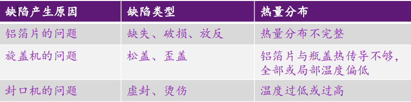 鋁箔片被電磁加熱之后,一方面融化熱封膜完成封口,另一方面通過熱傳導(dǎo)將熱量傳遞到瓶蓋,此時(shí)可以通過紅外熱成像相機(jī)捕捉到瓶蓋表面的熱量分布。此熱量分布直接反映的是墊片與瓶蓋的壓緊程度,而壓緊程度間接地反映出封口質(zhì)量。當(dāng)有封口缺陷產(chǎn)生時(shí),熱量分布會(huì)出現(xiàn)異常,其對應(yīng)關(guān)系如下: